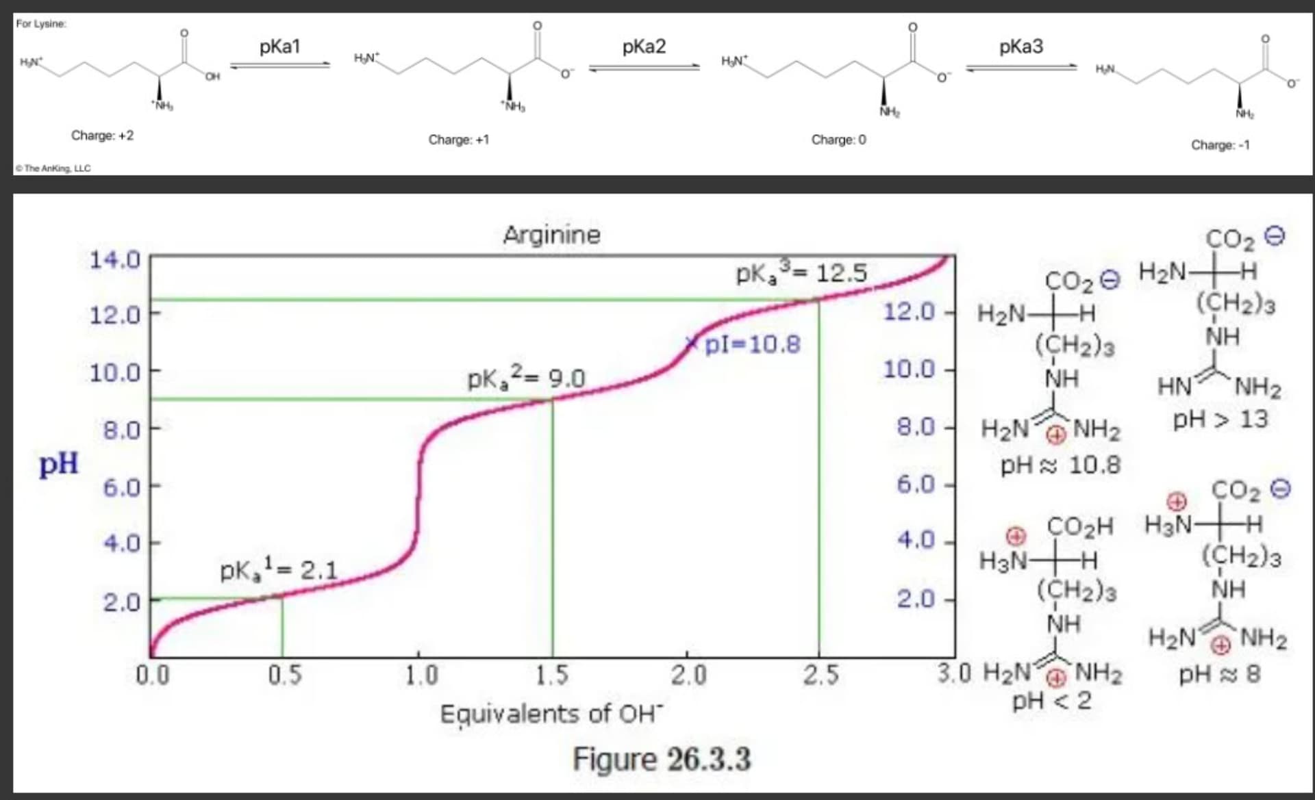 The error in stating “at the equivalence point, pH = pI” arises from a misinterpretation of the titration process for polyprotic molecules like amino acids. The original statement implies that when a proton is fully removed, reaching an equivalence point, the molecule’s net charge becomes zero and that this point is the pI. However, (ignoring the fact that this statement doesnt account for the multiple equivalence points displayed by amino acids) the real error made is that it doesnt account for the fact that deprotonation is a gradual process with overlapping equilibria. For example, at the second equivalence point for arginine, it may seem that the carboxyl group is fully deprotonated (–1 charge) and the α‐amino group is stoichiometrically deprotonated (neutral), while the guanidinium group remains protonated (+1 charge), which would suggest a net zero charge - aligning with our card. In reality, at the pH value corresponding to the second equivalence point, not every molecule has achieved this idealized state due to the gradual nature of the transition and the overlapping equilibrium with the protonated guanidinium group. Consequently, the overall net zero charge, the pI, is only reached when the equilibrium distribution of all protonation states averages to zero, which occurs at a higher pH then the second equivalence point (around 10.8 for arginine). pI is an equilibrium condition reflecting the overall charge distribution rather than a discrete stoichiometric endpoint. Mathematically, the isoelectric point (pI) for arginine is determined by balancing the acid–base equilibria of the ionizable groups that change charge in the pH range of interest. in this case, the α‑amino group (with pKa₂) and the guanidinium group (with pKa₃). Since the carboxyl group is already deprotonated (–1) at these pH values, the overall net charge is governed by the transition of the α‑amino group from its protonated (positive) to deprotonated (neutral) state and the gradual deprotonation of the guanidinium group (positive to neutral). At the pI, the effective positive charge from the guanidinium group is balanced by the loss of the positive charge from the α‑amino group.