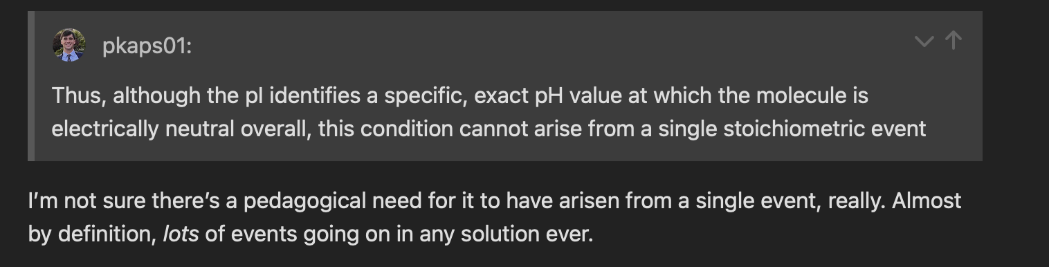 At the specific {{c2::equivalence point}} which would seemingly make the molecule have a net charge of 0 based purely on stoichiometry, the pH approximates the {{c1::pI}}.