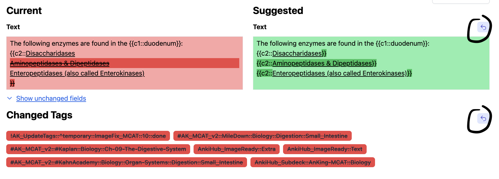 Agreed, some users add their own personalized edits to the cards & we wanna keep an eye out for that so that, if we are to accept a suggestion, it doesn’t affect other users and remains just a personalized edit for the author. As a maintainer, you’ll see a “revert” button for each section (e.g., Text, Extra, tags, etc). A quick press of that will resolve things