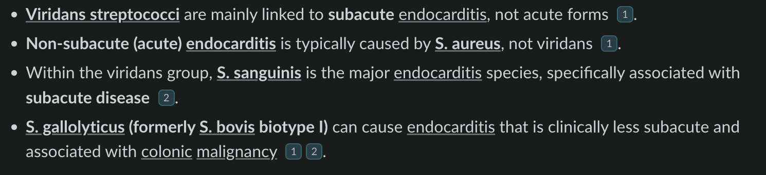 I think the sanguinis may be more associated with the endocarditis. Even the snip from schralp seemes to imply that mitis is not as important of a causative viridans strep. I do support chaning the non-subacute to subacute. “Non-subacute” is such an annoying term anyways bc you could just say “acute”