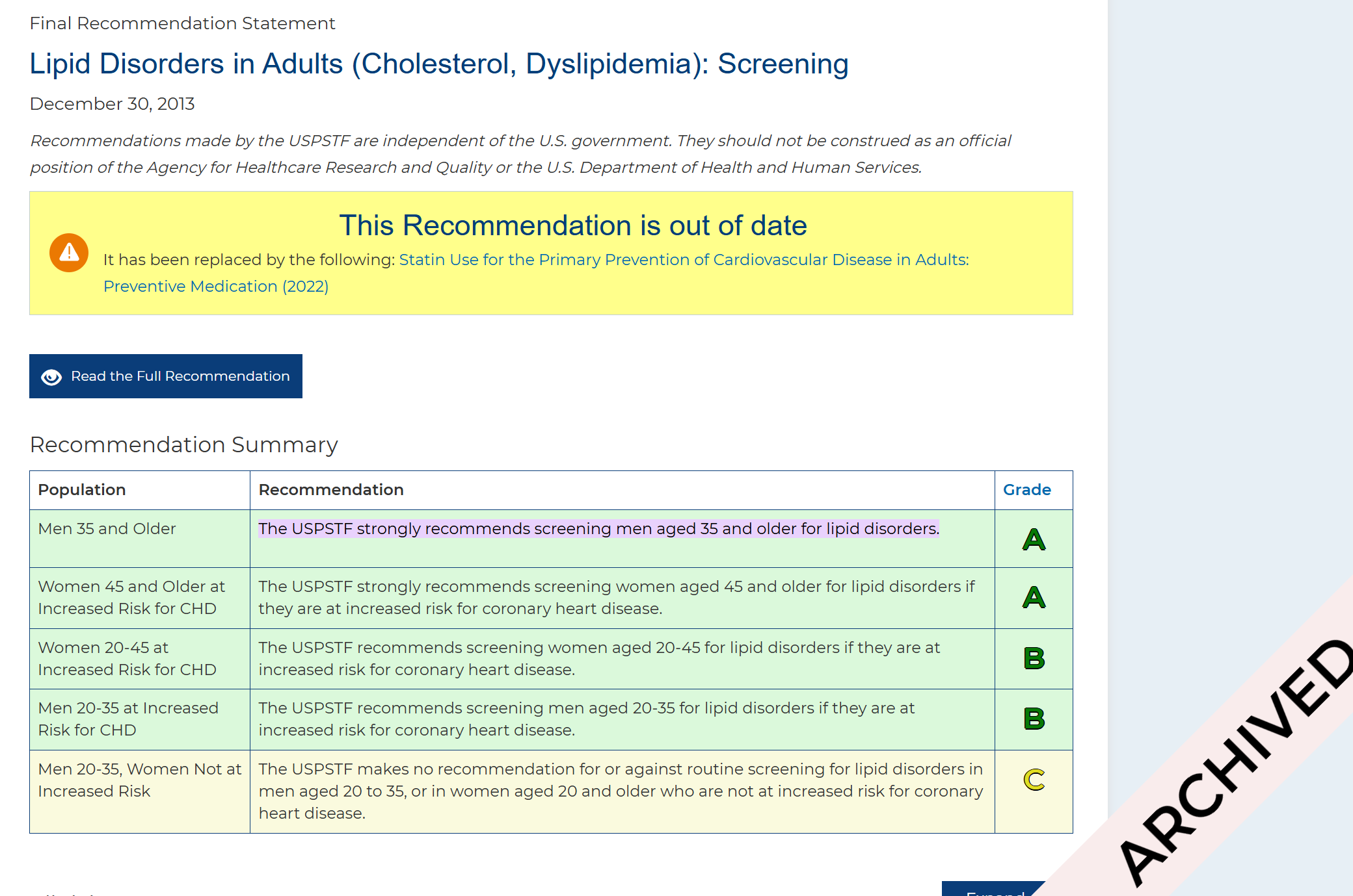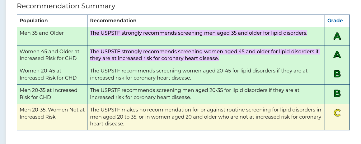 I’m wondering if the Extra field text meant to say that "the USPSTF no longer has universal recommendations for lipid screening in adults"? As they clearly do have recommendations for screening, from what I can see.