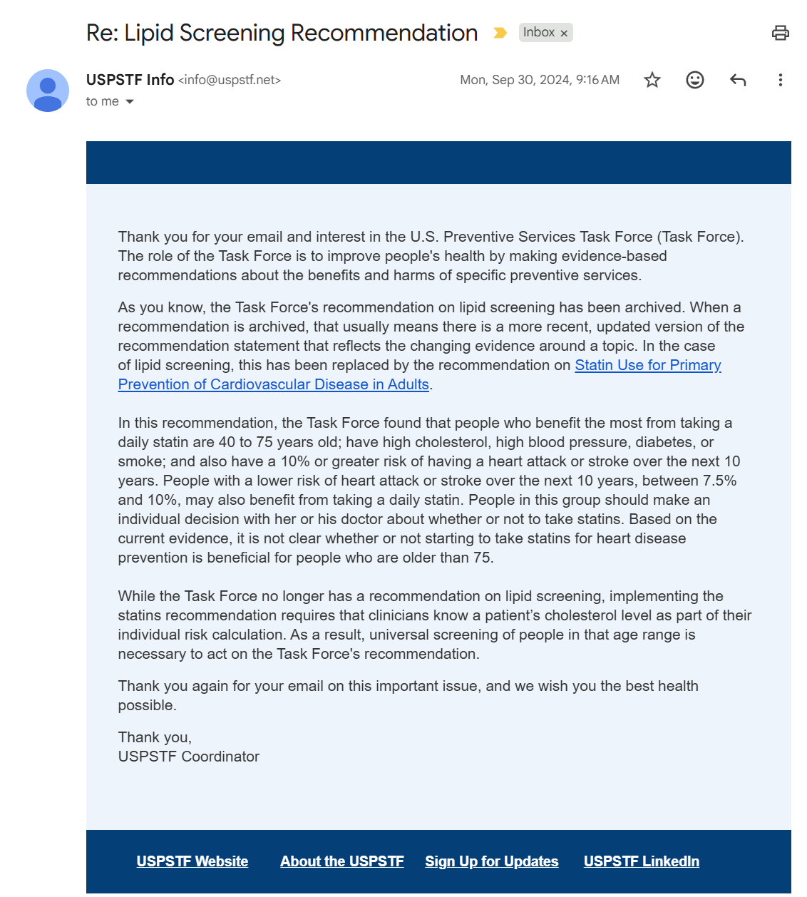 Hmmm, I’m not sure. I don’t remember this Slack conversation specifically. I do know that there was a shift towards using a CVD risk-based algorithm for statin prescription, but I’m not familiar with the guidelines/recommendations on dyslipidemia screening by the USPSTF or others.