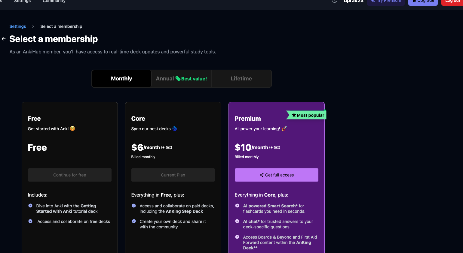 - On the AnkiHub web (top right avatar → Profile), make sure the email/username is the one with the Core membership.