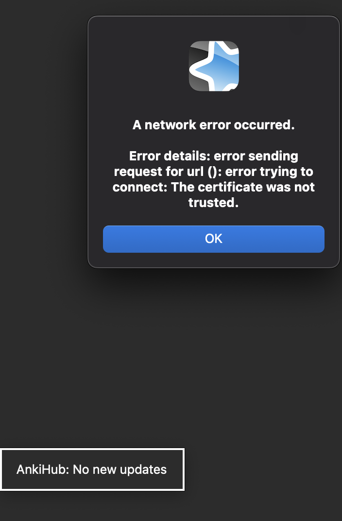 That specific error (âThe certificate was not trustedâ) means your Anki client canât establish a secure connection to AnkiHub. This is almost always a local machine / network / certificate issue, not your cards or decks.