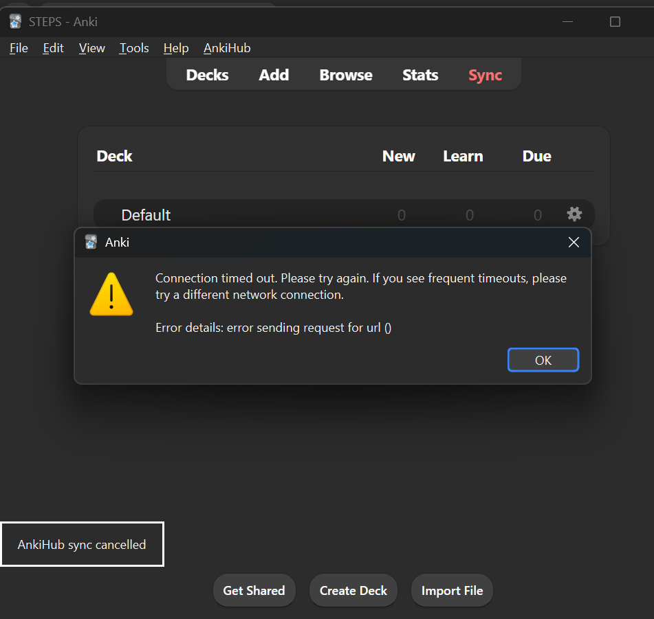 Anki sync keeps timing out, and on AnkiWeb the AnKing Step deck appears with 0 cards (0/0). I never received the deck locally because it only syncs through AnkiHub. I’ve tried reinstalling Anki, creating a new profile, disabling firewall/antivirus, and even using a phone hotspot, but nothing worked. I have run out of ways to try to fix this problem.