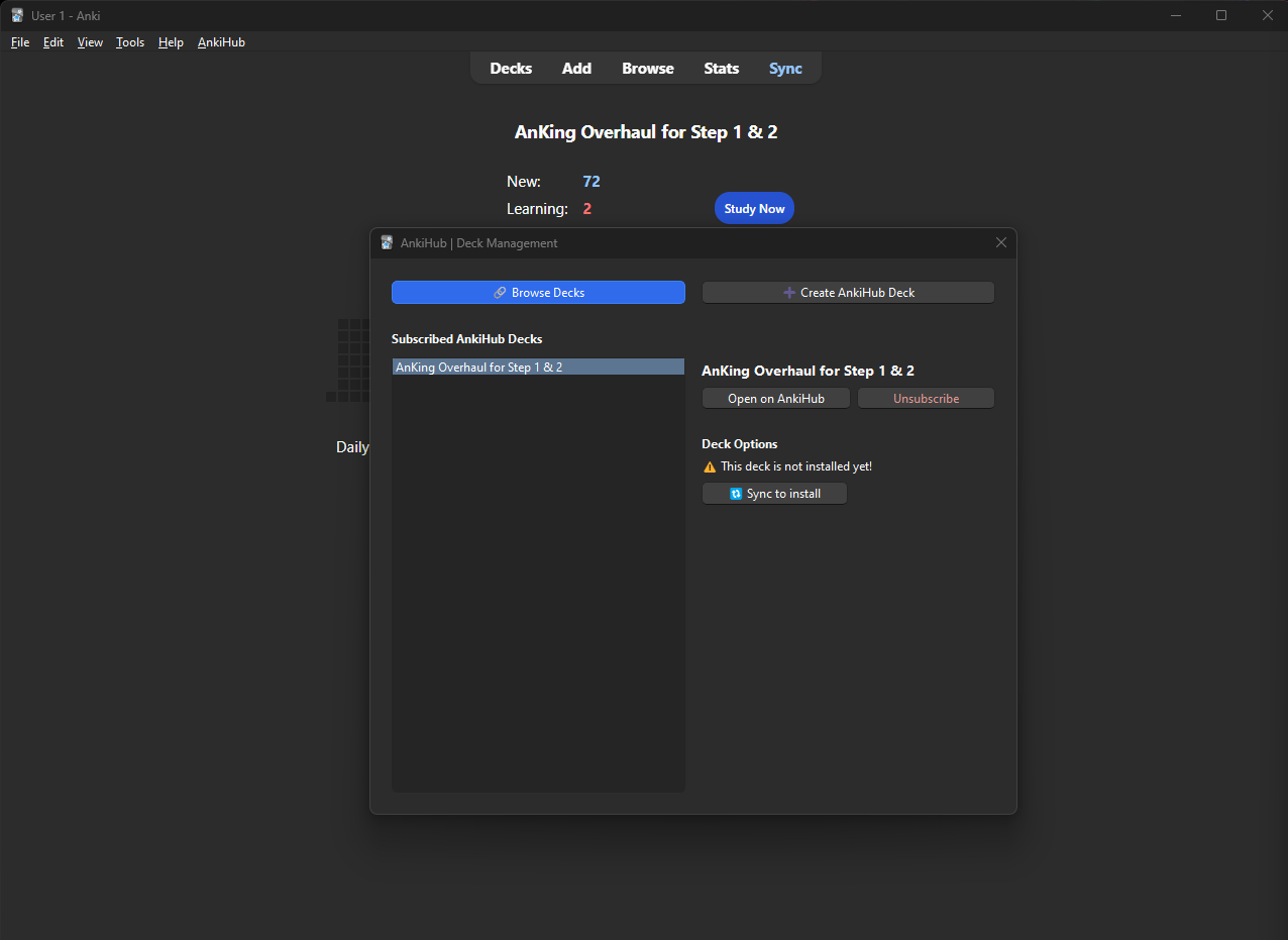 I have been working on the Step 1 and 2 deck a bit and realized I didn’t have the AnkiHub downloaded. Now I have downloaded but it doesn’t register that I already have the deck and it wants me to download a new one.