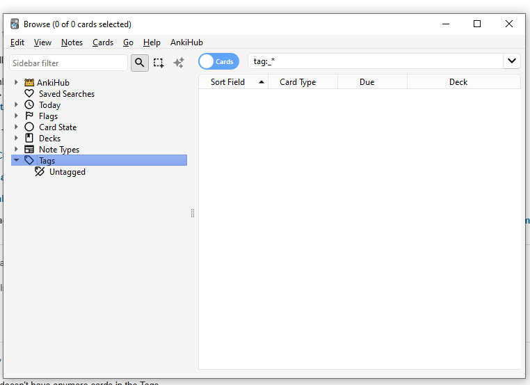 Can you please help? My Anki doesn’t have any more cards in the Tags. This is what I see after I deleted the cards I was reviewing.