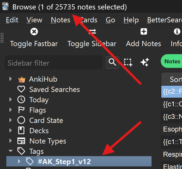 Then, please go to the Browser and click on the #AK_Step1_v12 tag. It should display the number of cards or notes. Could you let me know what number you see in your Anki?