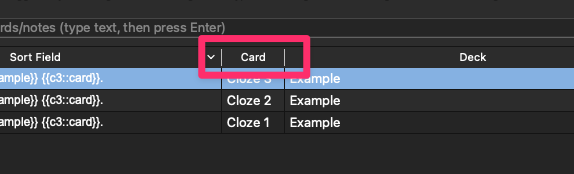 This will order your cards by this column. So all of the âcloze 3â cards will be in a row, etc. From here, you can select all of just the cloze-3 cards in isolation.