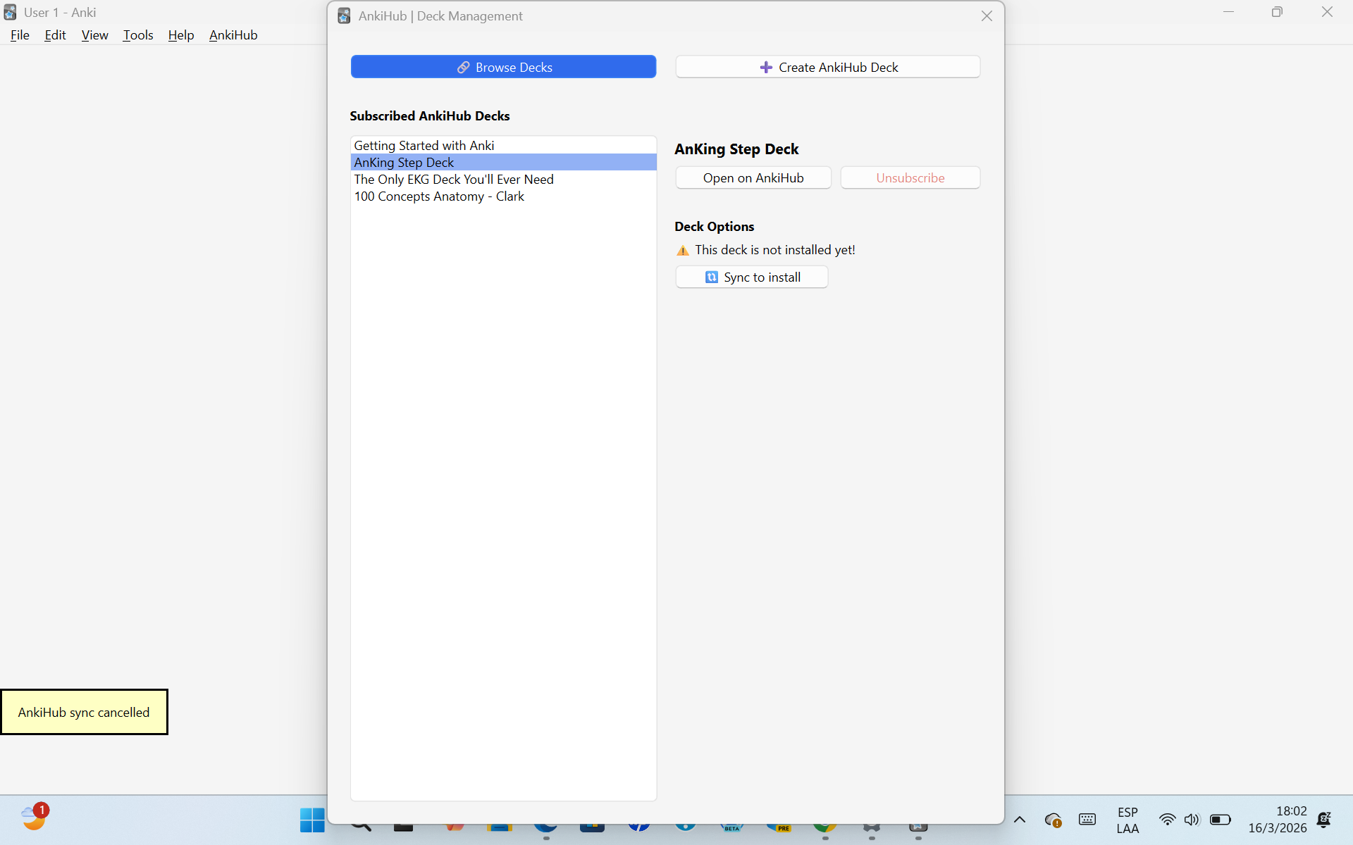 “AnkiHub sync cancelled” usually means something in the setup is blocking the add‑on before it can actually pull the deck. Let’s go step‑by‑step and rule out the common causes.