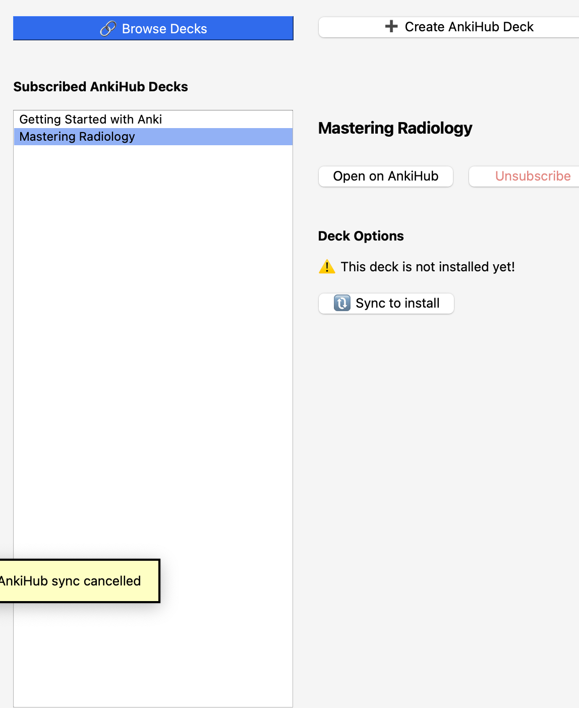 I already paid for the subscription and I am able to log in successfully on the AnkiHub website without any issues. However, in the Anki application, I keep getting errors (such as âcancelledâ) and Iâm unable to sync or update the decks.