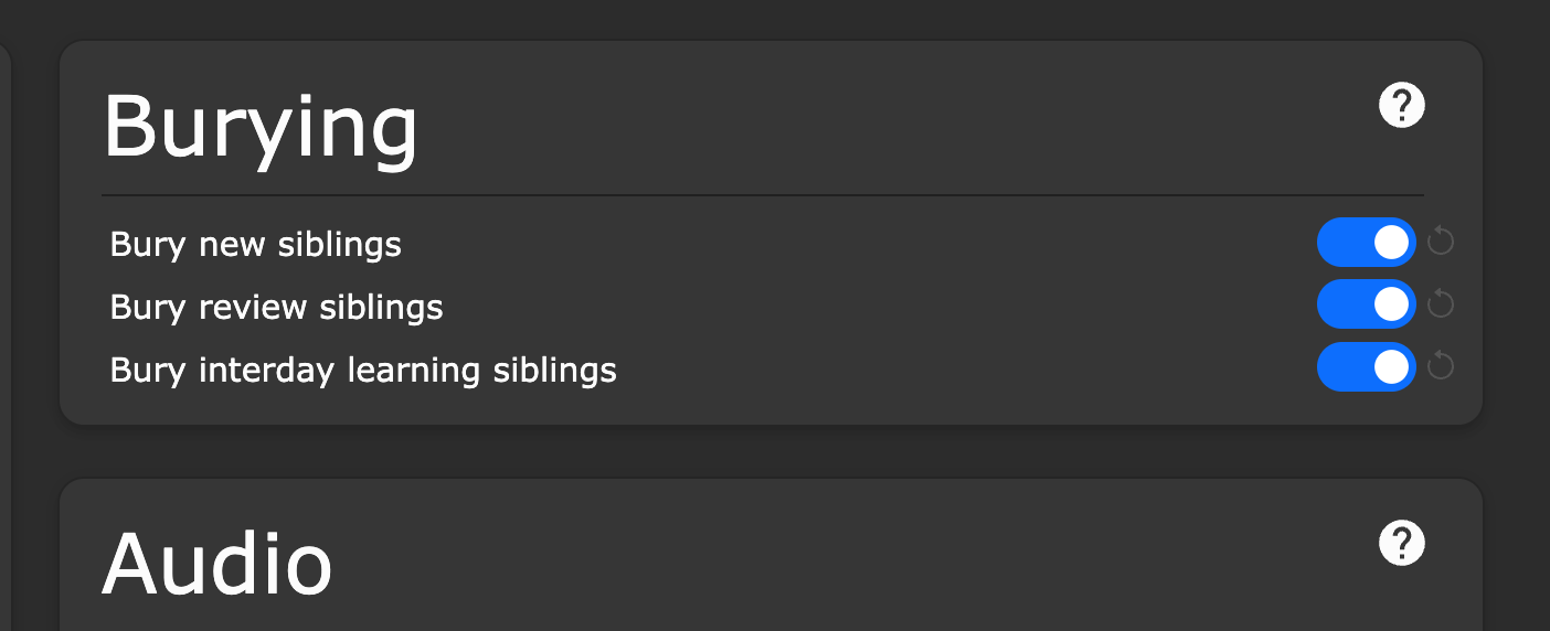 That being said, what may potentially be the case is that you may have one of the âsibling burialâ options toggled in your deck settings, as so: