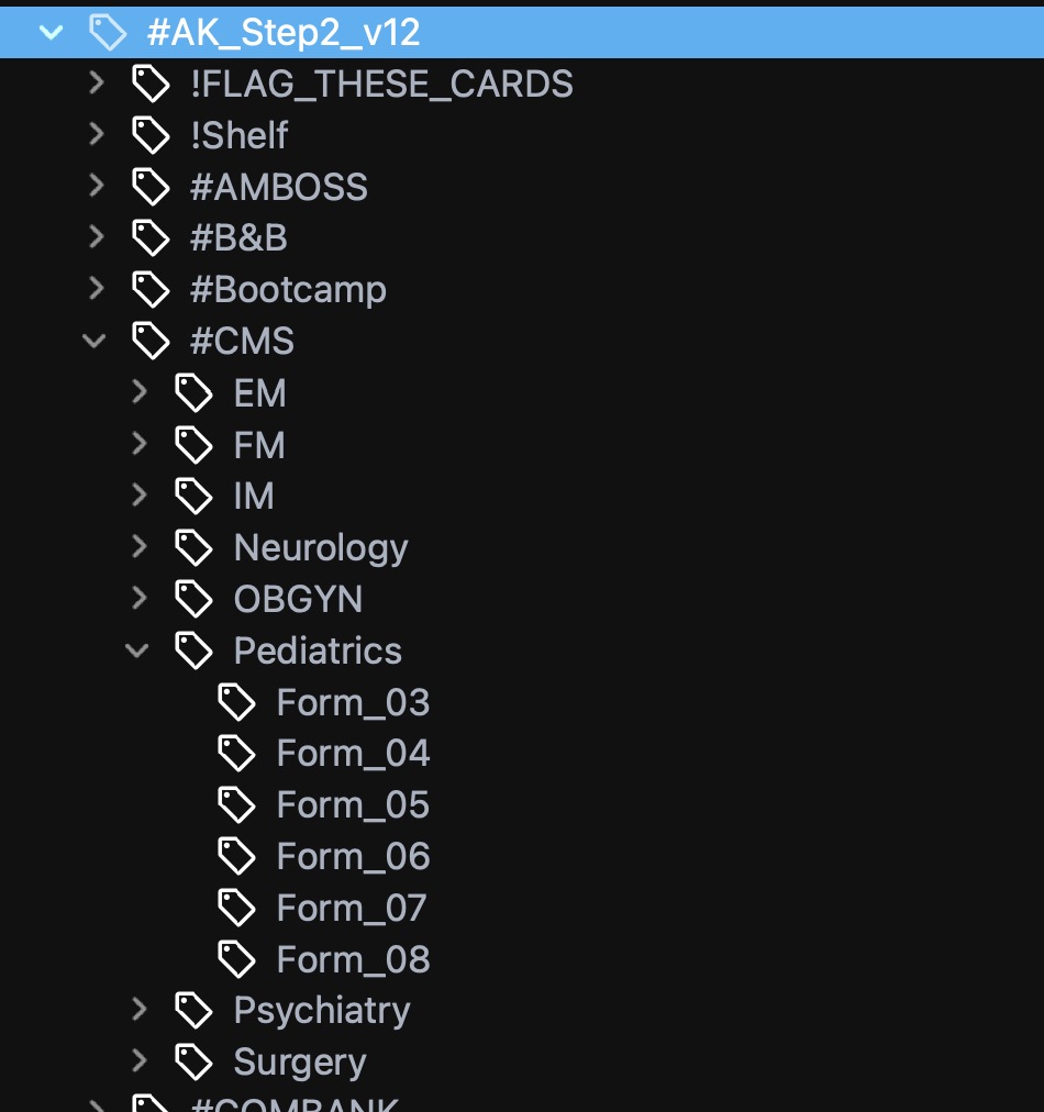 I just started taking my Peds CMS forms for shelf subject exams and I cannot see any tags for the CMS forms to unsuspend. I say in an update from June 2024 that there should be cards tags related to each CMS form but they are not listed anywhere for me. My friends have them in their decks.