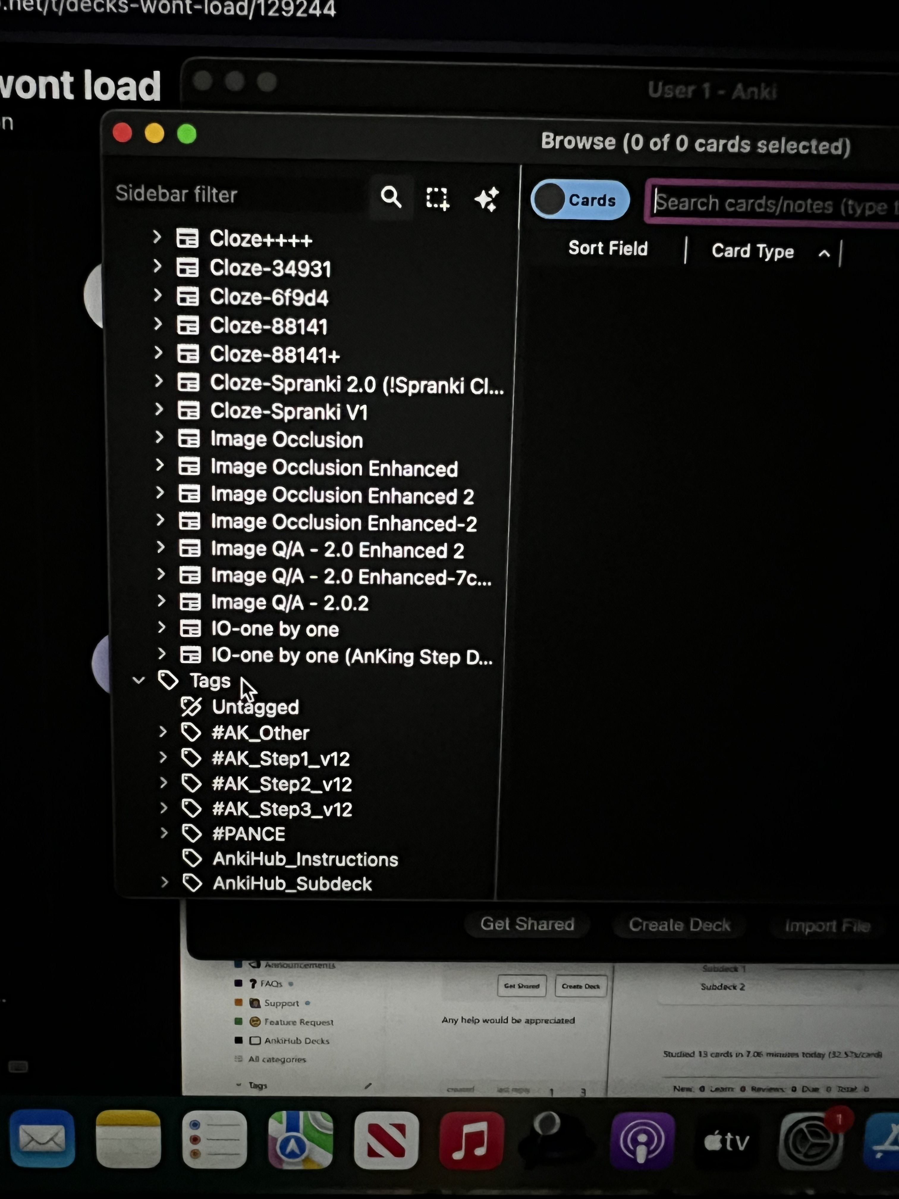 Iโll help you troubleshoot why no cards are showing up in your AnKing Step 1 deck. Let me search for some relevant information in our community forum.