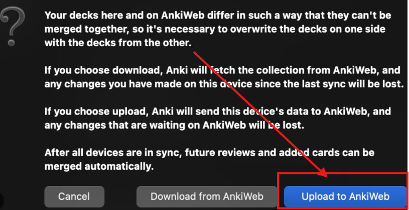 - Click Sync and when the message below appears, please click Upload to AnkiWeb. This will back up the corrected version of your deck to the cloud. If you click “Download,” the original issue will return.