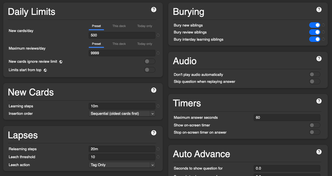 - Set Maximum reviews/day to something sustainable (example values):