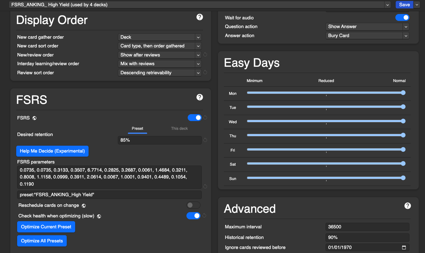 - In FSRS section, if you used “Help Me Decide,” click Optimize Preset again with:
