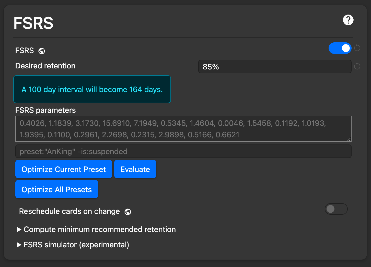 - FSRS enabled, but you don’t need to touch the parameter block manually.