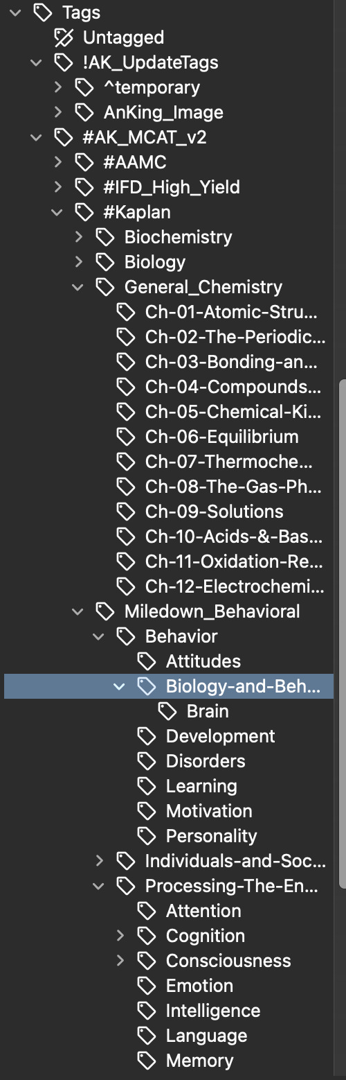 Looking at your screenshots, I can see that you’re using the AnKingMCAT MileDown deck and want to organize the Behavioral section by Kaplan chapters similar to how the General Chemistry section is organized.