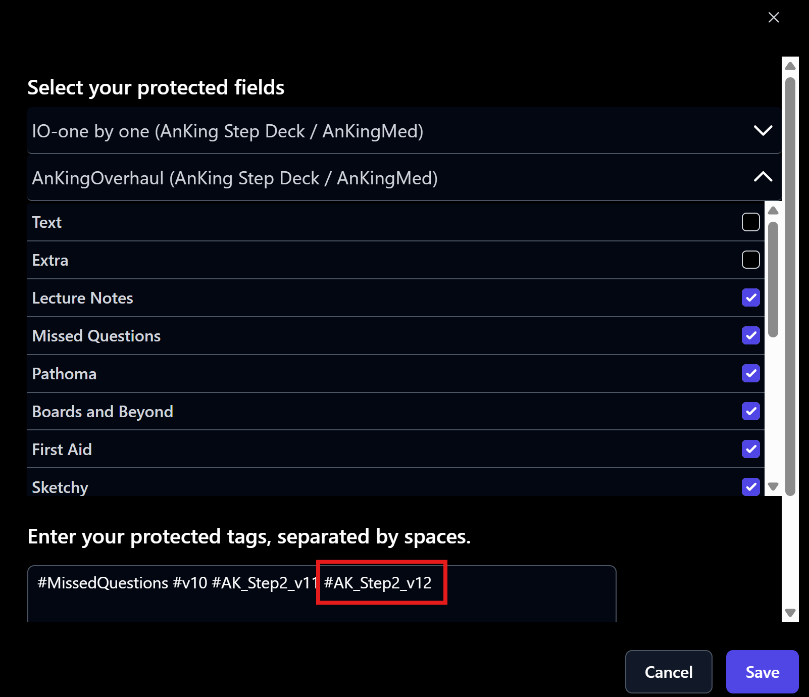 Also, I recommend removing this tag from your protected tags because it is the current tag used by the AnKing Step Deck. I donât think this is interfering with your issue, but if you keep this tag protected, you wonât receive any tag updates. If you havenât updated your deck in the past two years, your tags might be quite outdated. Please remove this tag, save your changes, and then reset local changes again.