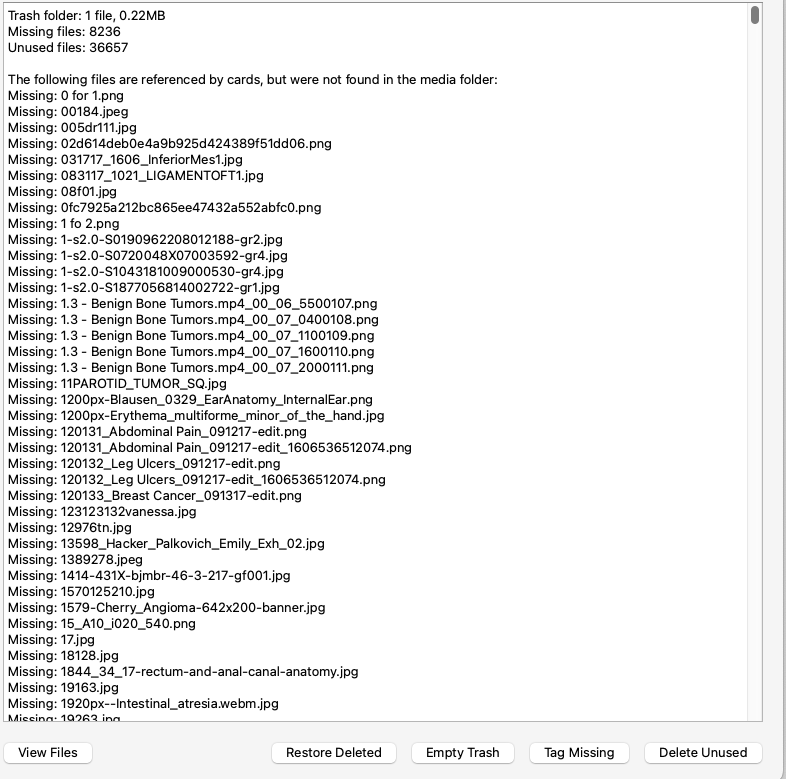Looking more closely through my cards I now have about 3400 cards tagged as missing media which is a big improvement from the 8000+ I started with. Some of the cards are only missing images in the resource fields and Iâve been able to study with those. Unfortunately thereâs still a good number missing images in the text or extra fields which I canât use.