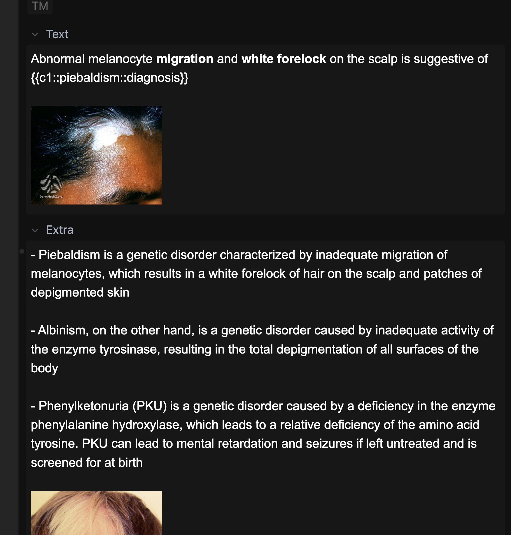 I notice that these images are very old cards. For example, the piebaldism card should look like this