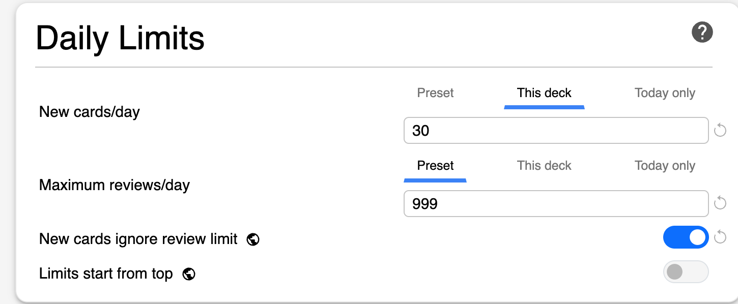 To explain a little quirk of Anki (which is actually expected behavior): if you set a parent deck limit to 30 and its subdecks to 30, you can study up to 30 cards in any subdeck. However, every card you review in a subdeck also counts toward the parent deck’s limit. For example, if the AnKing Step Deck has a limit of 30 and its subdeck has a limit of 30, reviewing 15 cards in the subdeck will leave 15 cards remaining in both the subdeck and the parent deck. If you finish all 30 cards in the subdeck, the parent deck will then show zero new cards.