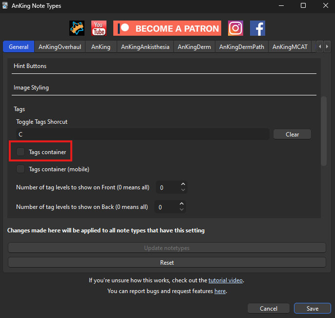 Then on your Anki main screen go to AnKing > AnKing Note Types. Find the tags tab and disable the tags container: