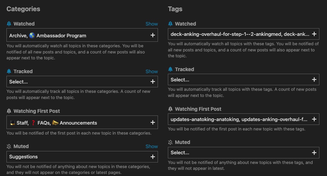 Try changing some tags and settings here. It took me a while to figure this out and I had the same issue where someone would comment and I would never get notified. The only thing that fixed it is setting the anking-overhaul tag to watching (but i get bombarded with notifications, not sure how it would work for you but you can try out different settings and see if it makes a difference