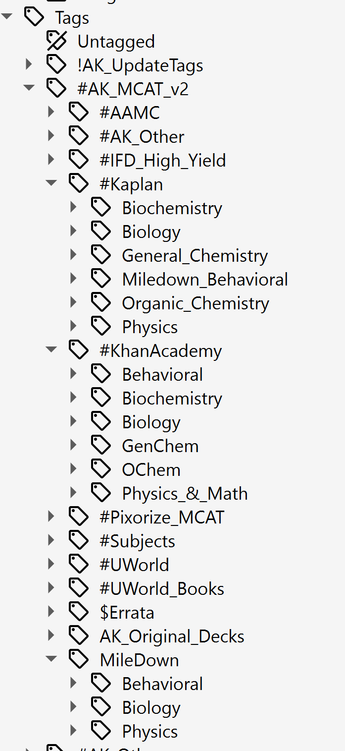 If you’d like to see the tags organization, you can go to Browse → tags → #AK_MCAT_v2 to see all the available tag structures.