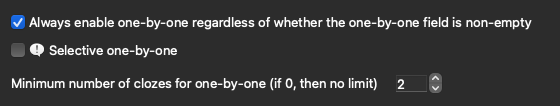 When I uncheck âAlways enable oneâbyâoneâ but leave âMinimum number of clozes = 2â, the card becomes a normal cloze (no oneâbyâone)