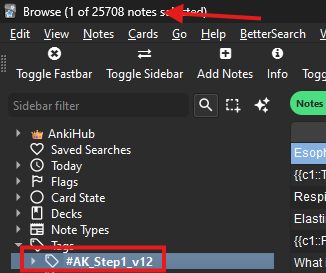 Thank you very much for your reply. When I click “Stats” and check the “card counts” it says that the total number of my cards is 13,470. However, When I click browse and check Ak Step1 v12, it says “1 of 31918 cards selected”.