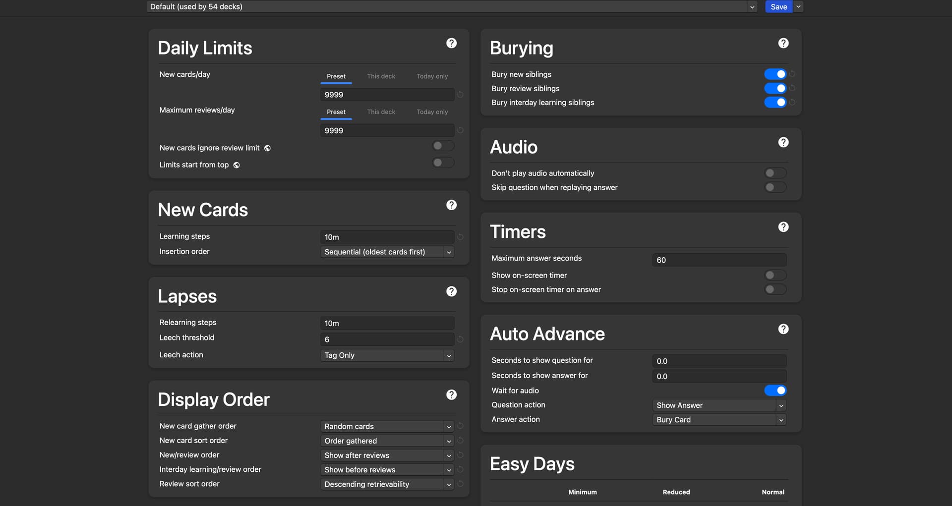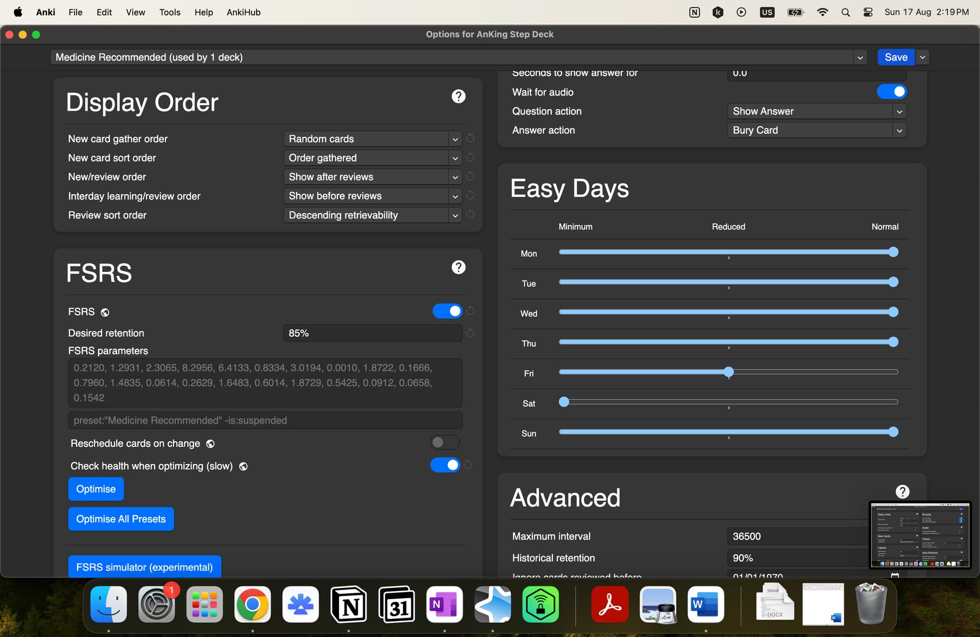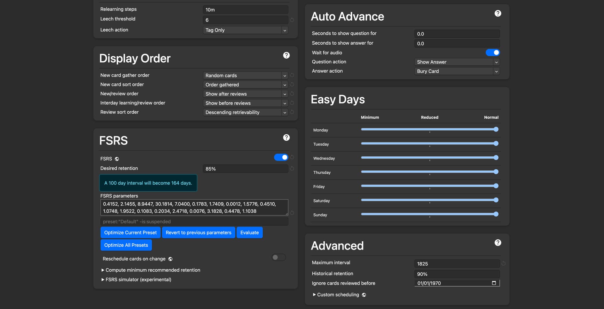 Hey, thanks for the replies guys! Here are my settings. My retention is set at 85% and I normally unsuspend cards from pathoma and try them like 30 minutes to an hour after watching the videos and skimming through the textbook. If I know the answer I press good, if I don’t again, if I found the concept hard or got it wrong multiple times I used hard.