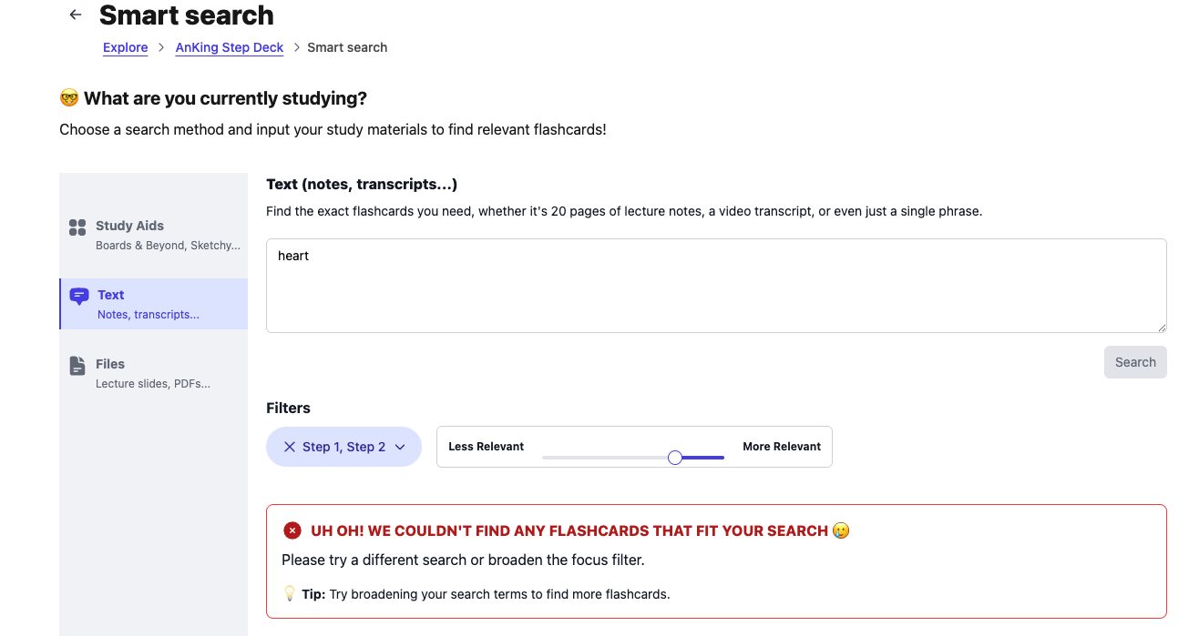 If your cards are only local in Anki and you havenât pushed them to AnkiHub or subscribed to any shared decks, Smart Search wonât have anything to search throughâhence the âcouldnât find any flashcardsâ message even for common words like âheartâ.