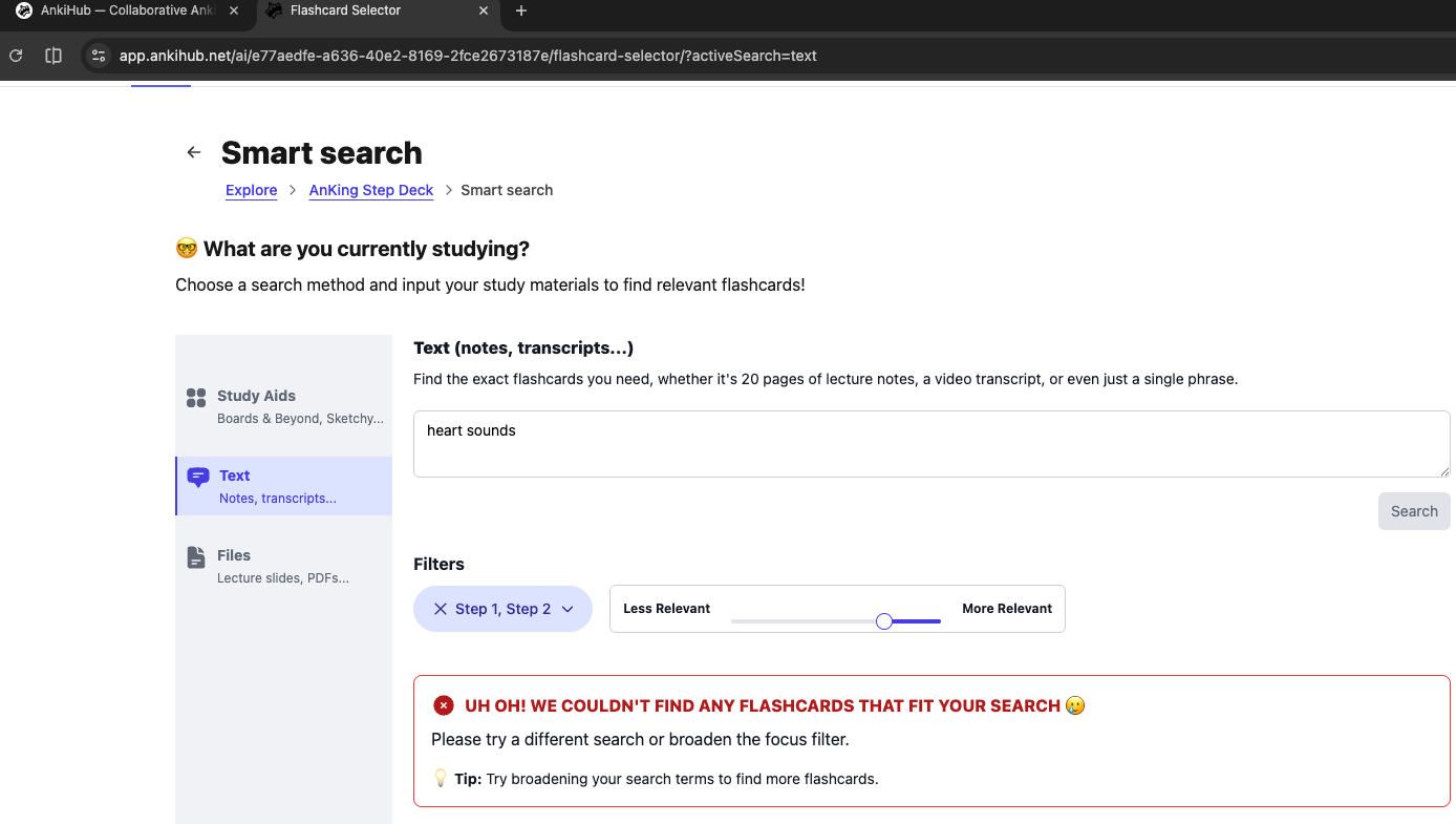 - If you mainly use personal/local decks that are not on AnkiHub, Smart Search will return nothing even for common terms because it has no indexed cards for your account.