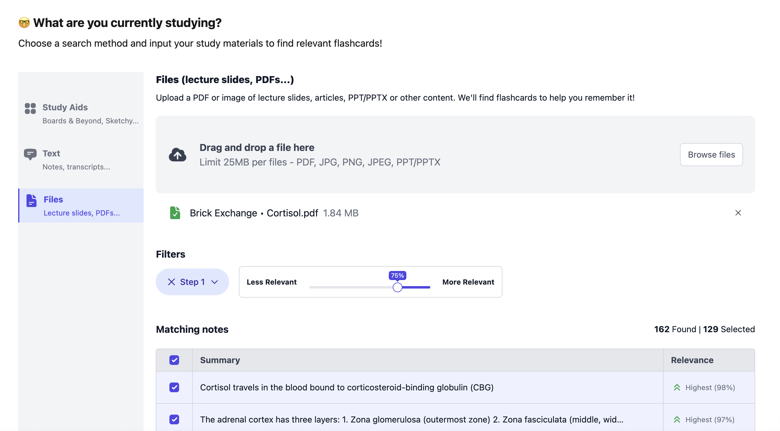 - Roughly what kind of files/text are you using? (e.g., USMLE-style PDF chapter, lecture slides saved as PDF, textbook pages, etc.)