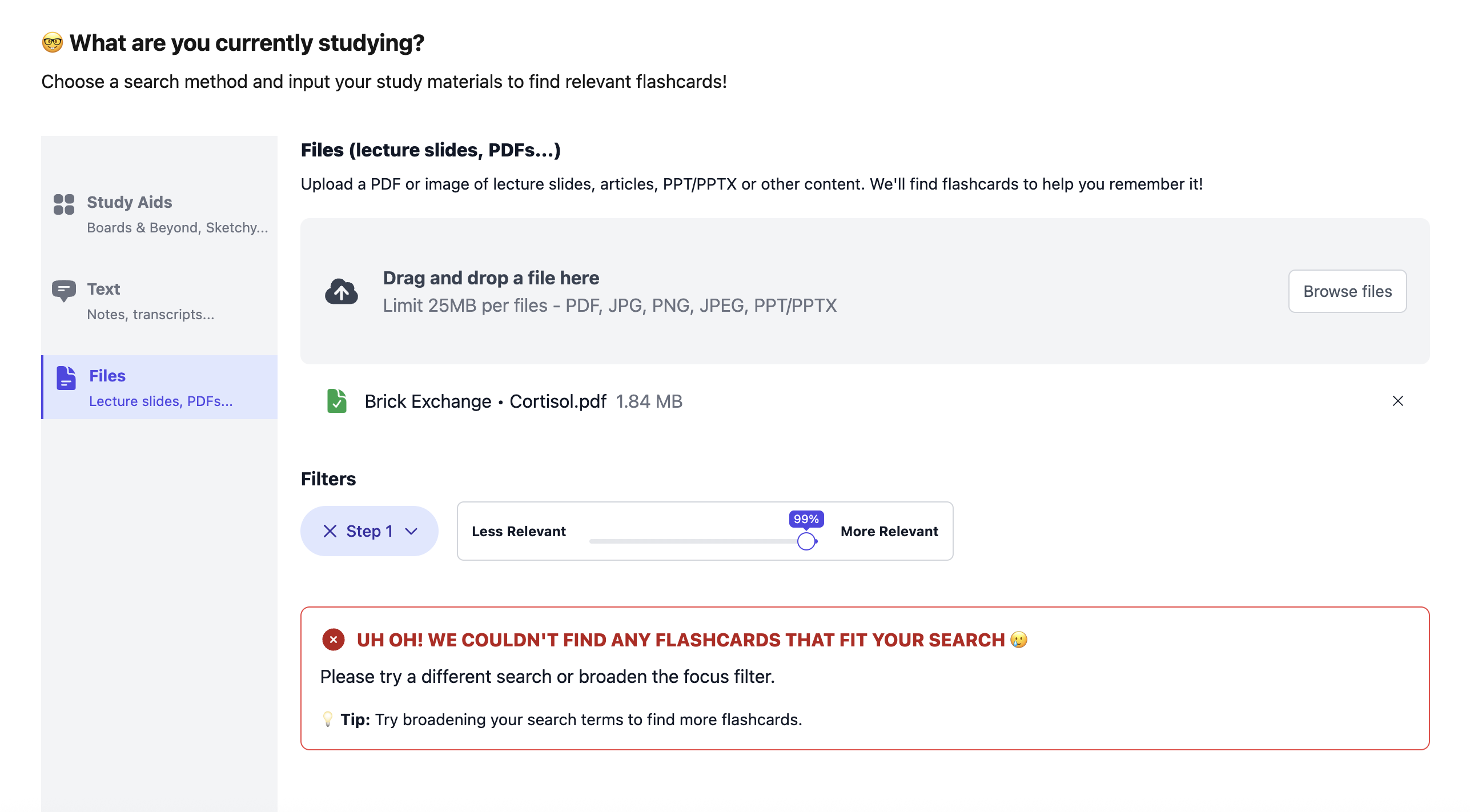 I am having trouble with smart search. Usually can upload text/pdfs and set it to the highest level of relevancy and typically, there will be lots of cards. However, now when i do this, it know says the following: UH OH! WE COULDNâT FIND ANY FLASHCARDS THAT FIT YOUR SEARCH