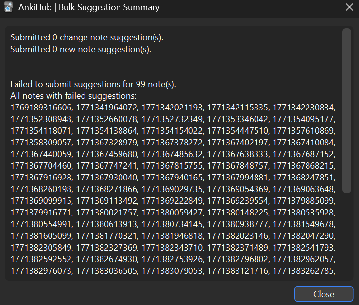 These notes showing under ID Pending suggests a local problem. I assume the Suggest button is labeled āSuggest a new noteā in the editor for note 1771383372585? Any difference if you trigger a sync from AnkiHub > Sync with AnkiHub?