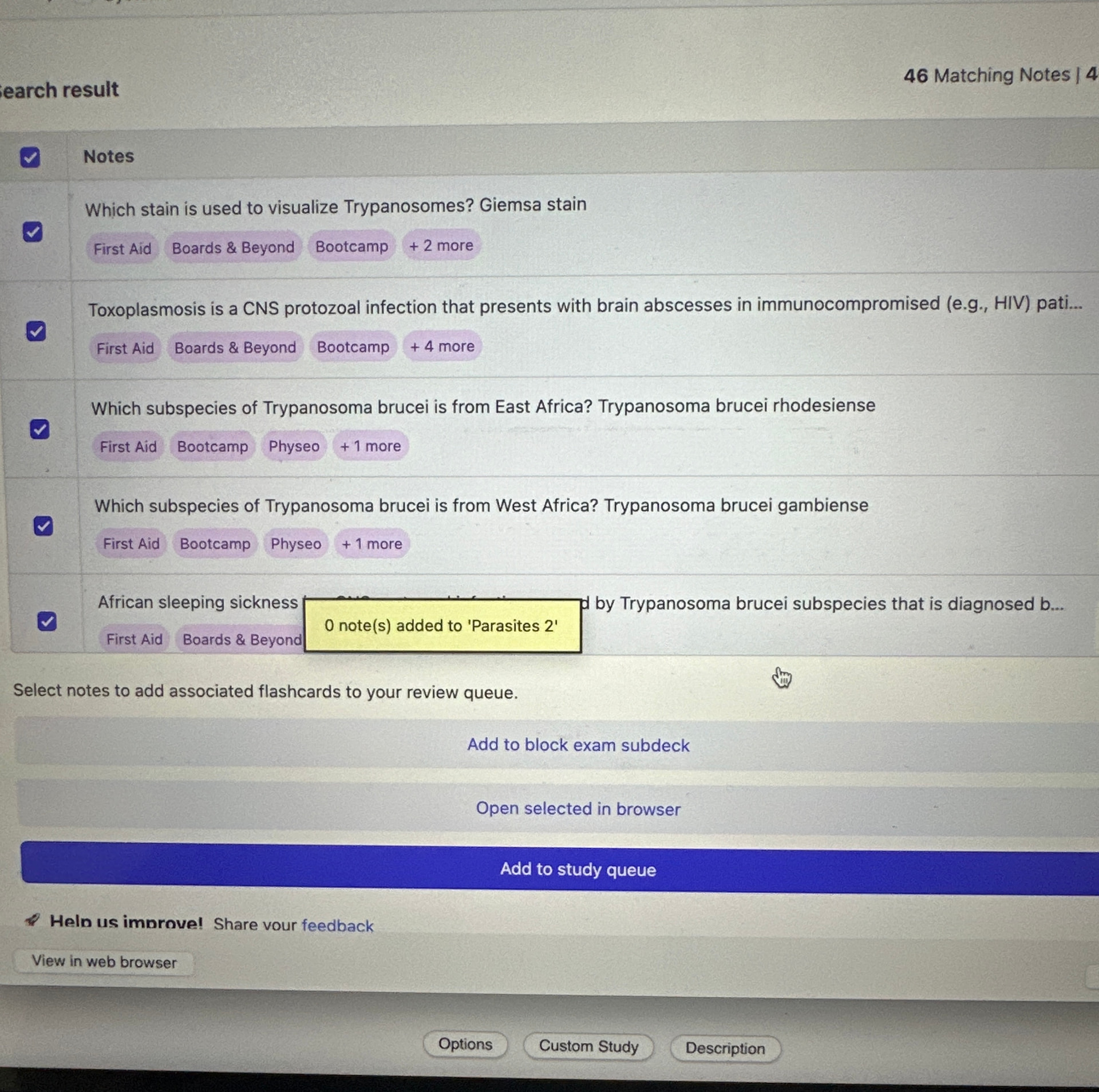 “Trying to put cards on a sub deck, but after selecting the cards and creating the deck it says 0 notes added. Also it does not add them to card queue”